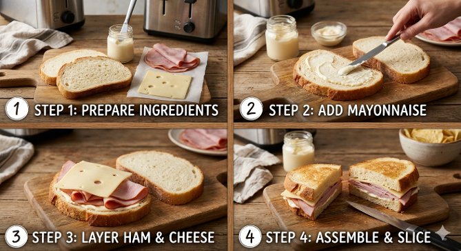 , lay two slices of ham over the bottom piece of bread.